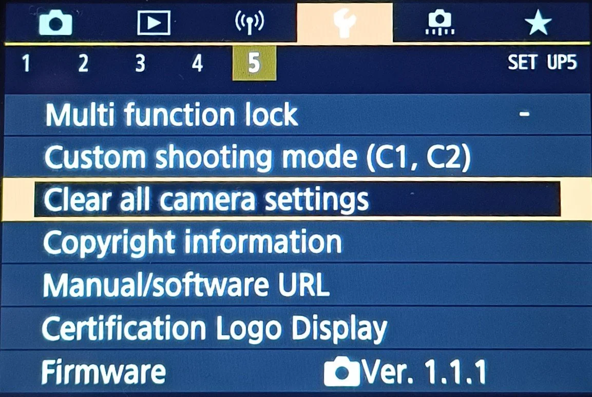 To make sure there is nothing wrong with the camera we need to start with a reset. Resetting the camera settings on a Canon 90D via the "Clear all camera settings" menu, returns all settings to default, such as Picture Styles, metering modes, AF settings, and other custom functions, to the factory state; however, it does not delete image files or format (does not format the memory card) but Bluetooth/Wi-Fi connections may need to be reset on both the camera and paired devices.